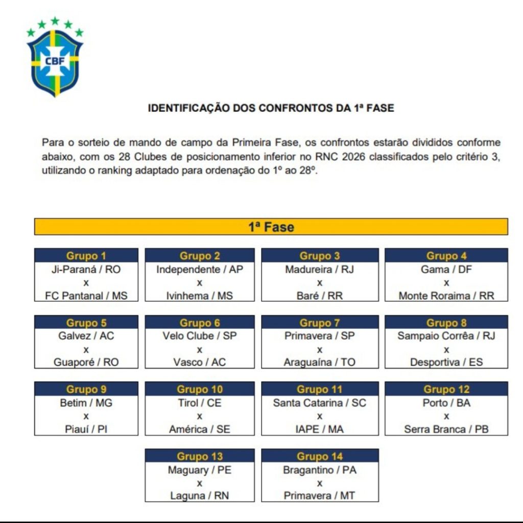 A Confederação Brasileira de Futebol (CBF) deu o pontapé inicial na organização da Copa do Brasil de 2026. Na tarde desta segunda-feira, a entidade confirmou oficialmente os confrontos da primeira fase, definidos com base no Ranking Nacional de Clubes (RNC), além de detalhar o critério de desempate para equipes da mesma federação.Em partidas únicas, os clubes com melhor campanha no campeonato estadual terão vantagem em caso de igualdade no tempo regulamentar, avançando diretamente à fase seguinte.