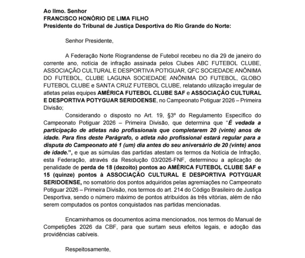 O documento aponta que as duas equipes teriam utilizado os atletas Elias Vitor Conceição dos Santos (América), Fabrício Cabral da Silva (Potyguar) e Caio Vinícius da Cruz Lima (Potyguar) de forma irregular, uma vez que os estes participaram do Campeonato apresentando contrato amador, mesmo já tendo 20 anos de idade, o que fere o parágrafo 3° do artigo 19 do Regulamento Específico da 1ª Divisão do Campeonato Potiguar 2026, que veda a participação de atleta não profissional a partir da data que completa 20 anos.